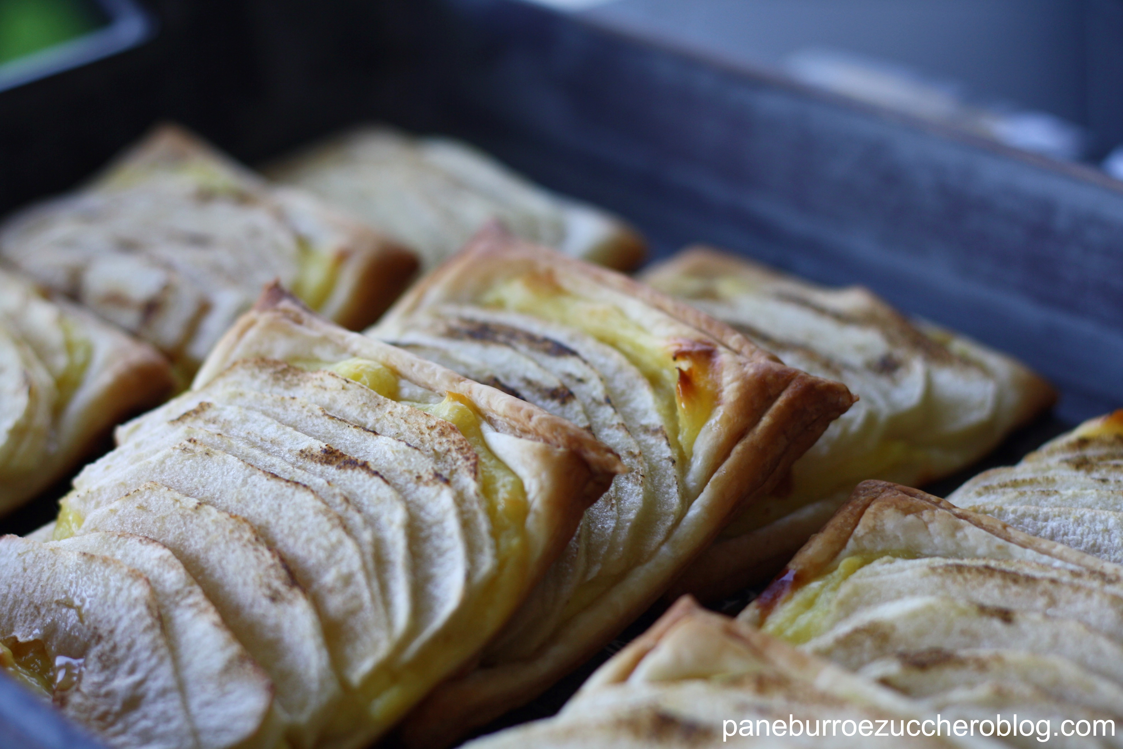 Ho visto queste sfogliatine esposte in bella vista presso Le Pain Quotidien, uno dei miei posti preferiti dove pranzare o fare uno spuntino con qualcosa di naturale, sano e sempre freschissimo, e non ho saputo resistere, arrivata a casa le ho provate a fare e sono venute benissimo al primo colpo! Oltre che belle queste “tartelettes aux pommes” a base di pasta sfoglia, crema pasticcera e mele, sono facili da fare, semplici e deliziose, direi che è perfetto! Non ci resta altro che prepararle e sistemarle ben alllineate su un vassoio per catapultarsi in uno di quei boulanger parigini che sfornano delizie a ogni ora!