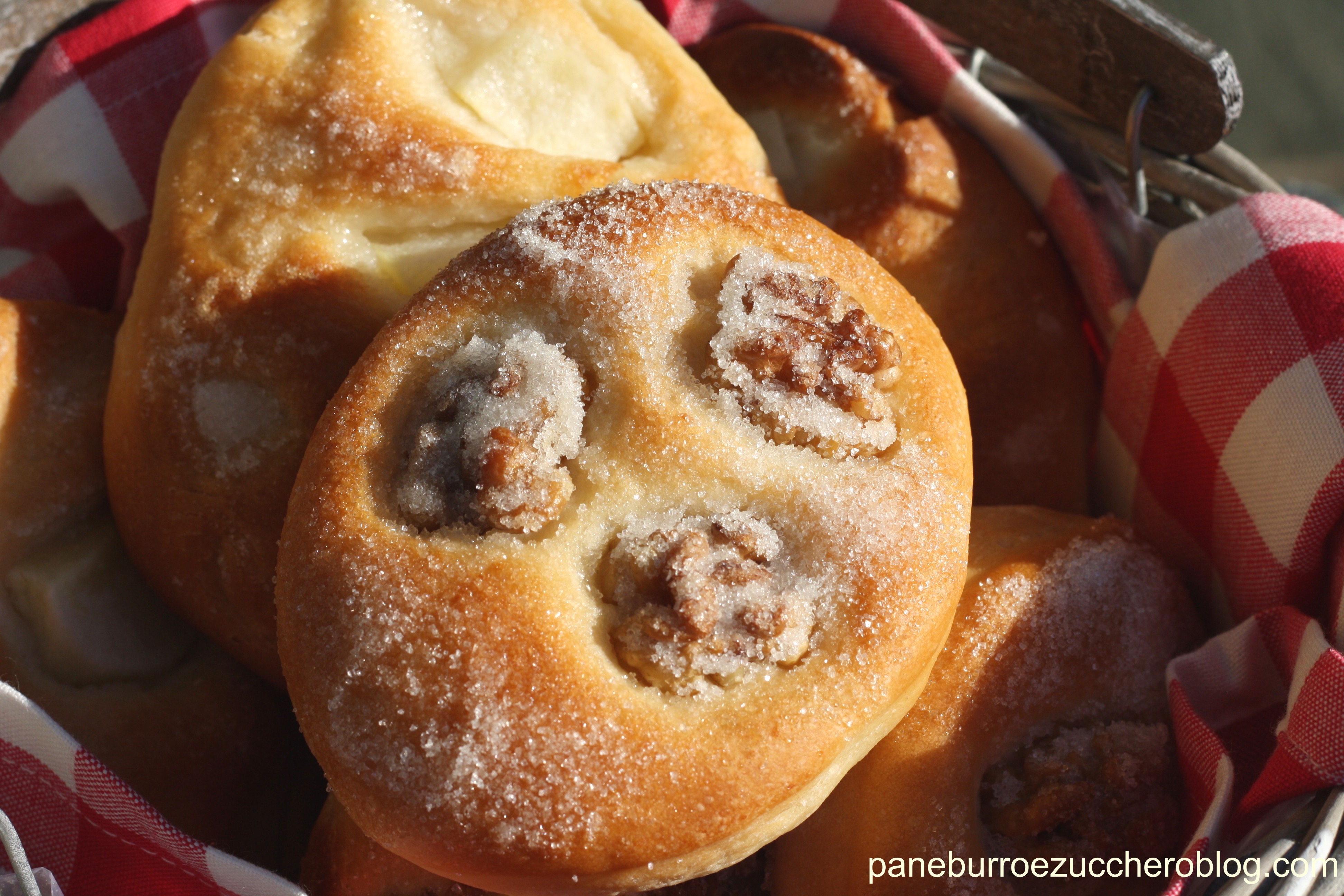 Sbucciate e riducete le mele a fettine. Su alcune focaccine premete le fettine di mela, su altre premete i gherigli di noci in modo che sprofondino bene nell’impasto. Su ciascuna focaccina mettete un paio di fiocchetti di burro morbido e cospargete con un cucchiaino di zucchero bianco.