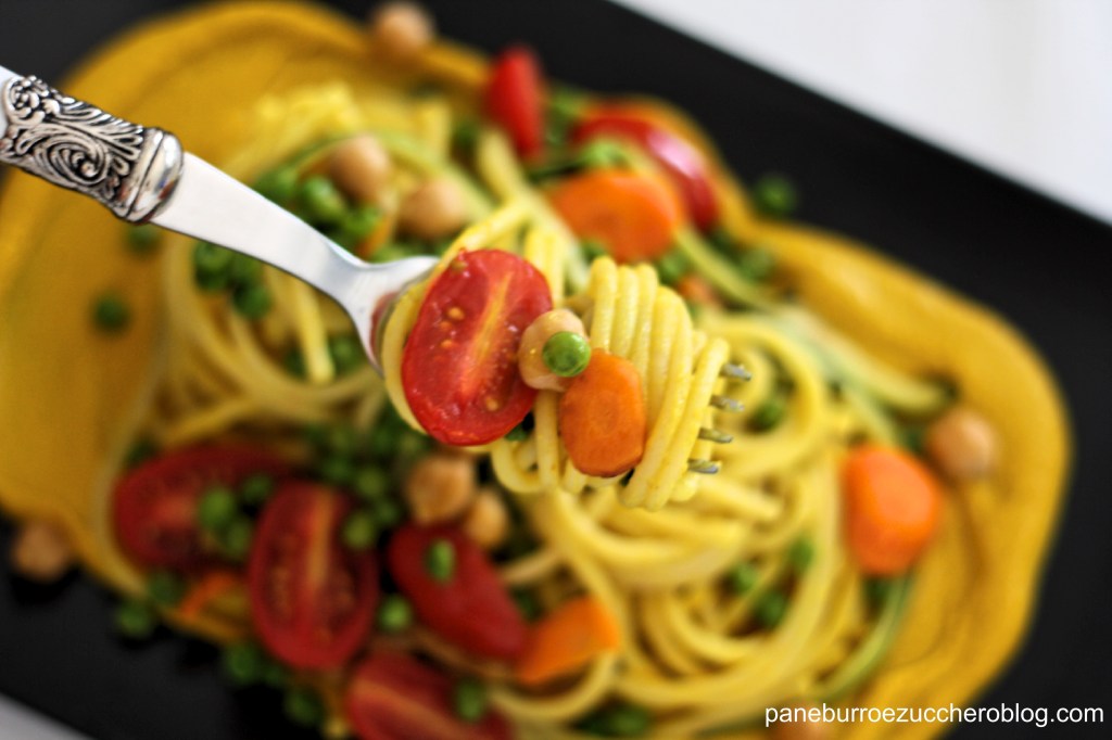 Un bel piatto di pasta semplice ma bello da vedere e salutare è la nostra scelta per il pranzo di oggi: carboidrati + proteine vegetali + verdure = la combinazione perfetta per un pasto all’insegna del benessere e vi posso assicurare che è anche buonissima! La cremina di ceci al parmigiano e curry con l’aggiunta di un po’ di curcuma rende golosa la pasta e le verdure così colorate vivacizzano il piatto e lo completano arricchendolo di gusti e consistenze diverse! Provate e ditemi se non è squisita!