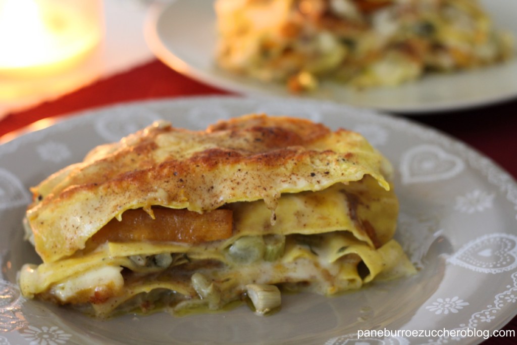 Una bella idea per un primo piatto che fa sempre un po’ festa: le lasagne in casa nostra raramente si mangiano alla bolognese, più facile che siano vegetariane, o addirittura fatte con le sfoglie di pane carasau al posto della pasta all’uovo e nessuno si è mai lamentato, anzi! Oggi ho preparato questa versione alle verdure fatta con zucca e finocchi, un ottimo abbinamento secondo me, arricchita da formaggio brie, qualche seme di finocchio e una besciamella leggera ma avvolgente con tanta noce moscata e una bella spolverata di parmigiano grattugiato che crea una crosticina deliziosa in superficie! Se volete sperimentare potete sostituire la pasta per lasagne con il pane carasau, non ne rimarrete delusi!