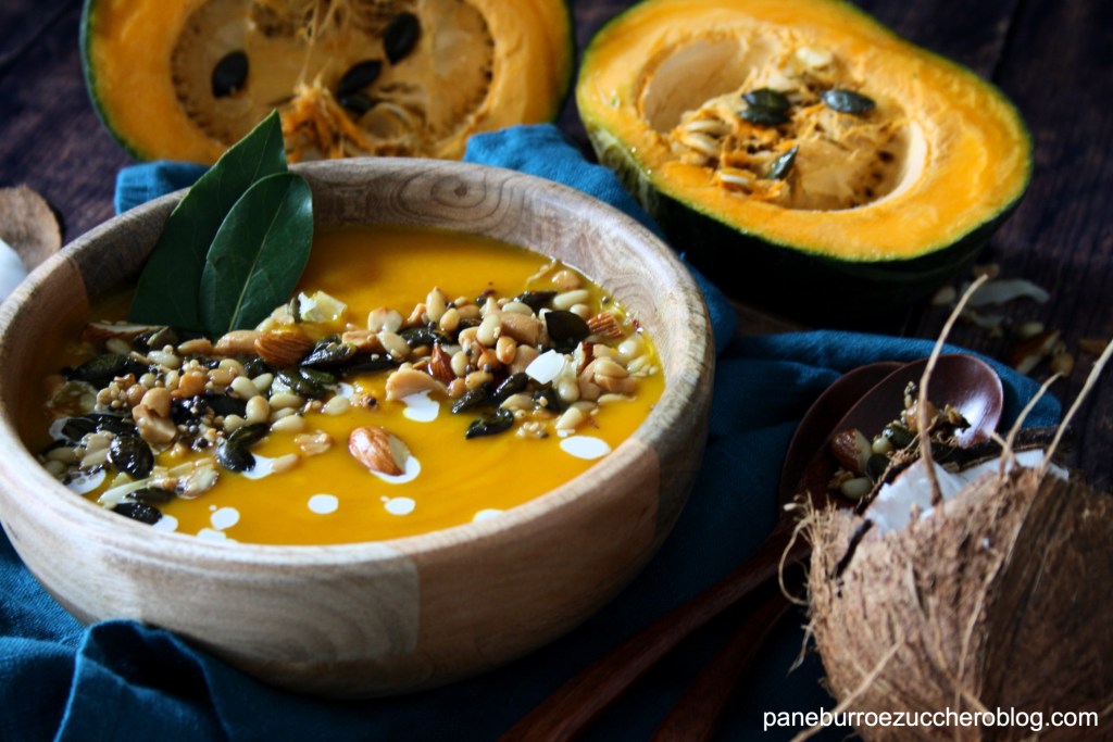 Finalmente è iniziato l’autunno e posso preparare le mie vellutate preferite! Non avevo ancora postato questa crema di zucca thai che cucino molto volentieri in questa stagione, vi sembrerà strano ma l’unione di zucca, un pizzico di curry e un tocco di latte di cocco creano un gusto davvero magico, dolce al punto giusto ma anche speziato e aromatico. La consistenza è molto vellutata, io la lascio sempre un po’ densa e la guarnisco con un mix croccante di pinoli, semi e frutta secca. A piacere potete aggiungere anche dei crostini di pane tostato per una cena ricca e gustosa!