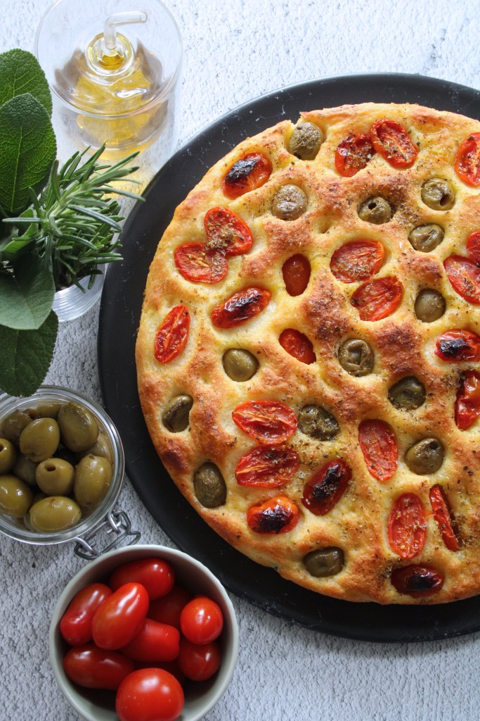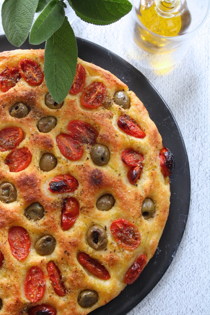 La mia prima focaccia barese! Non l’avevo mai preparata – non chiedetemi perché – e devo dire che è venuta molto bene! Impasto super morbido, alto e soffice con la crosticina sul fondo e in superficie tanti pomodorini e olive condite da buon olio pugliese e origano! Avrei forse dovuto abbondare con i pomodorini…. di sicuro la preparerò ancora con tanti pomodori, nel frattempo riporto la ricetta tratta da una puntata della serie di Nadia Caterina Munno, “The Pasta Queen”!