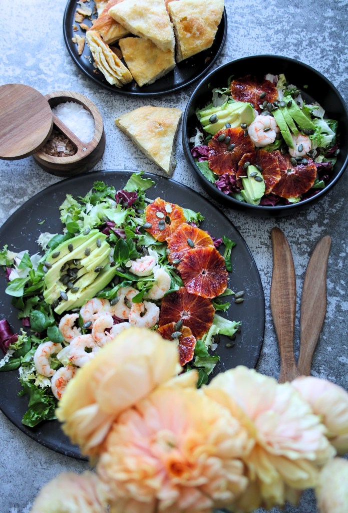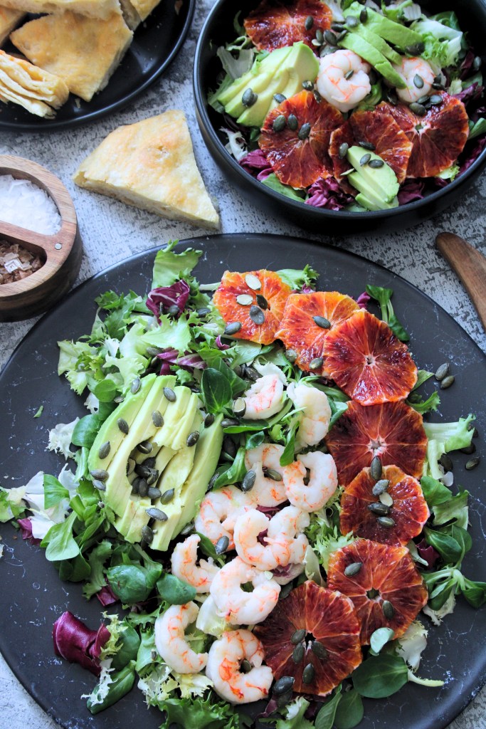 Pranzare “solo con una insalata” a casa nostra vuol dire fare un pranzo delizioso! Le mie insalate sono sempre ricche di sapori e di ingredienti salutari, spesso prevedono anche della frutta per un perfetto mix di sapori e dato che le accompagno con un buon pane fatto in casa diventano un vero e proprio pranzo da re! L’insalata di oggi prevede insalata verde in abbondanza (in inverno la preparo anche con finocchi affettati al velo ed è ottima) avocado, gamberi scottati, arancia rossa e semi di zucca e l’ho condita con una vinaigrette all’arancia e sciroppo d’acero, deliziosa! L’ho servita con una focaccia di cui vi riporto la ricetta per ogni evenienza!