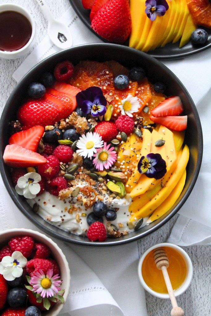 Per preparare una bella ciotola invitante vi consiglio di prendere una ciotola carina non troppo fonda e sistemare su un lato il vostro yogurt preferito (yogurt greco, skyr, yogurt di soia o yogurt bianco) e tagliate la frutta che volete utilizzare.