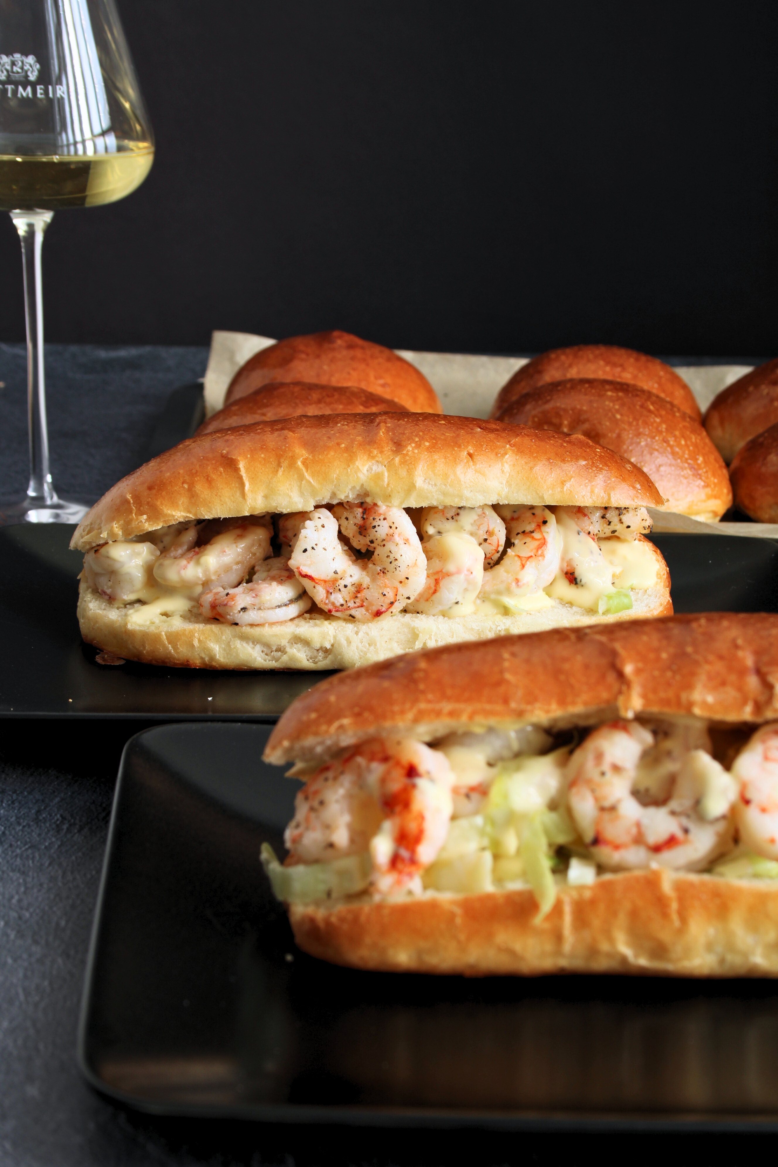 Quando il pane è completamente freddo, tagliatelo a metà e farcitelo con i gamberoni precedentemente scottati in padella con olio sale e pepe, l’insalata pan di zucchero leggermente condita con olio e sale e completate il tutto con un po’ di maionese leggermente diluita con del succo di limone. Dosate gli ingredienti e le quantità in base ai vostri gusti, unico consiglio: siate generosi!