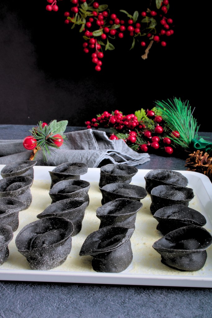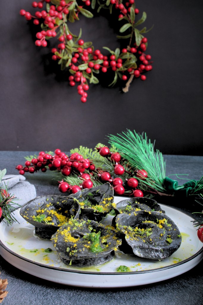 Bellissimi e buonissimi questi ravioli preparati con pasta fresca al nero di seppia e ripieni di baccalà mantecato fatto in casa. La ricetta è di Cooker girl (Aurora Cavallo) che come sapete ho incontrato diverse volte a corsi e presentazioni, è solo grazie a lei se ho superato il timore di cimentarmi con pasta fresca e ravioli! Si servono con beurre blanc, olio al prezzemolo, bottarga e scorza di limone per un tocco in più! Molto buoni ed eleganti, perfetti per una cena di coppia – magari per la Vigilia di Natale? – richiedono un pochino di lavoro ma ne vale la pena!
