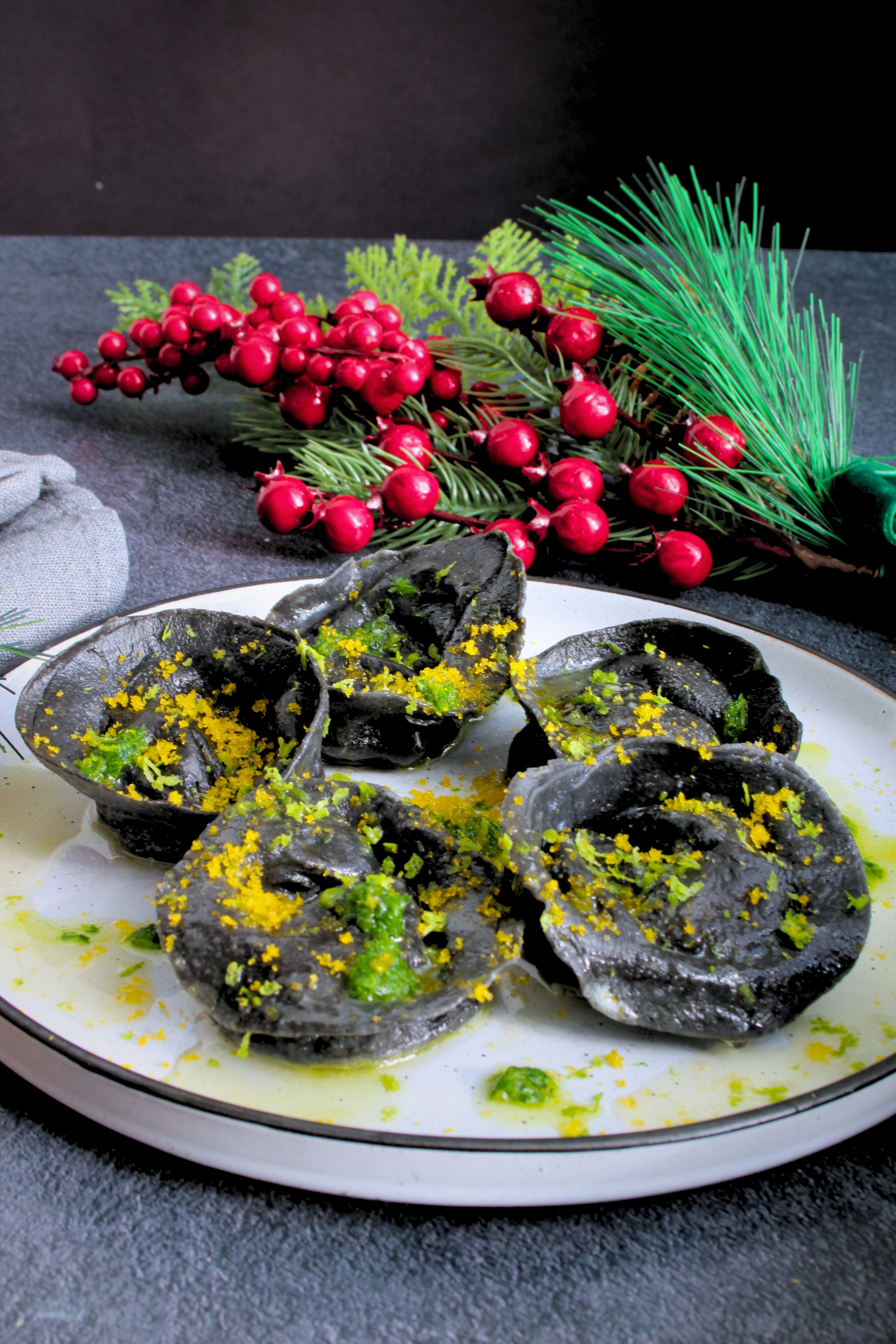 Bellissimi e buonissimi questi ravioli preparati con pasta fresca al nero di seppia e ripieni di baccalà mantecato fatto in casa. La ricetta è di Cooker girl (Aurora Cavallo) che come sapete ho incontrato diverse volte a corsi e presentazioni, è solo grazie a lei se ho superato il timore di cimentarmi con pasta fresca e ravioli! Si servono con beurre blanc, olio al prezzemolo, bottarga e scorza di limone per un tocco in più! Molto buoni ed eleganti, perfetti per una cena di coppia – magari per la Vigilia di Natale? – richiedono un pochino di lavoro ma ne vale la pena!